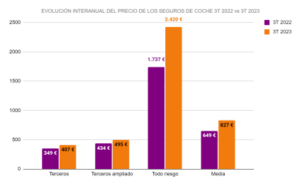 Según se desprenden del ‘Índice de precios del seguro de coche’ elaborado por Kelisto.es, los seguros de Autos se encarecieron un 27% en el tercer trimestre de 2023 con respecto al mismo periodo del año anterior. Esto se traduce en un aumento de 178 euros en la prima anual, pasando de un coste promedio de la póliza de 649 a 827 euros, unos niveles jamás vistos en el sector. La modalidad de todo riesgo continúa liderando con un encarecimiento inédito en todos los registros del 39% entre julio y septiembre de 2023 y el mismo periodo del año anterior.